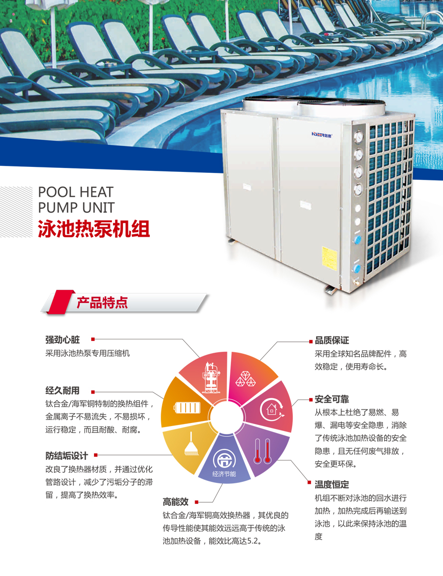 钛合金/海军铜高效换热器,其优良的传导性能使其能效远远高于传统的泳池加热设备,能效比高达5.2
